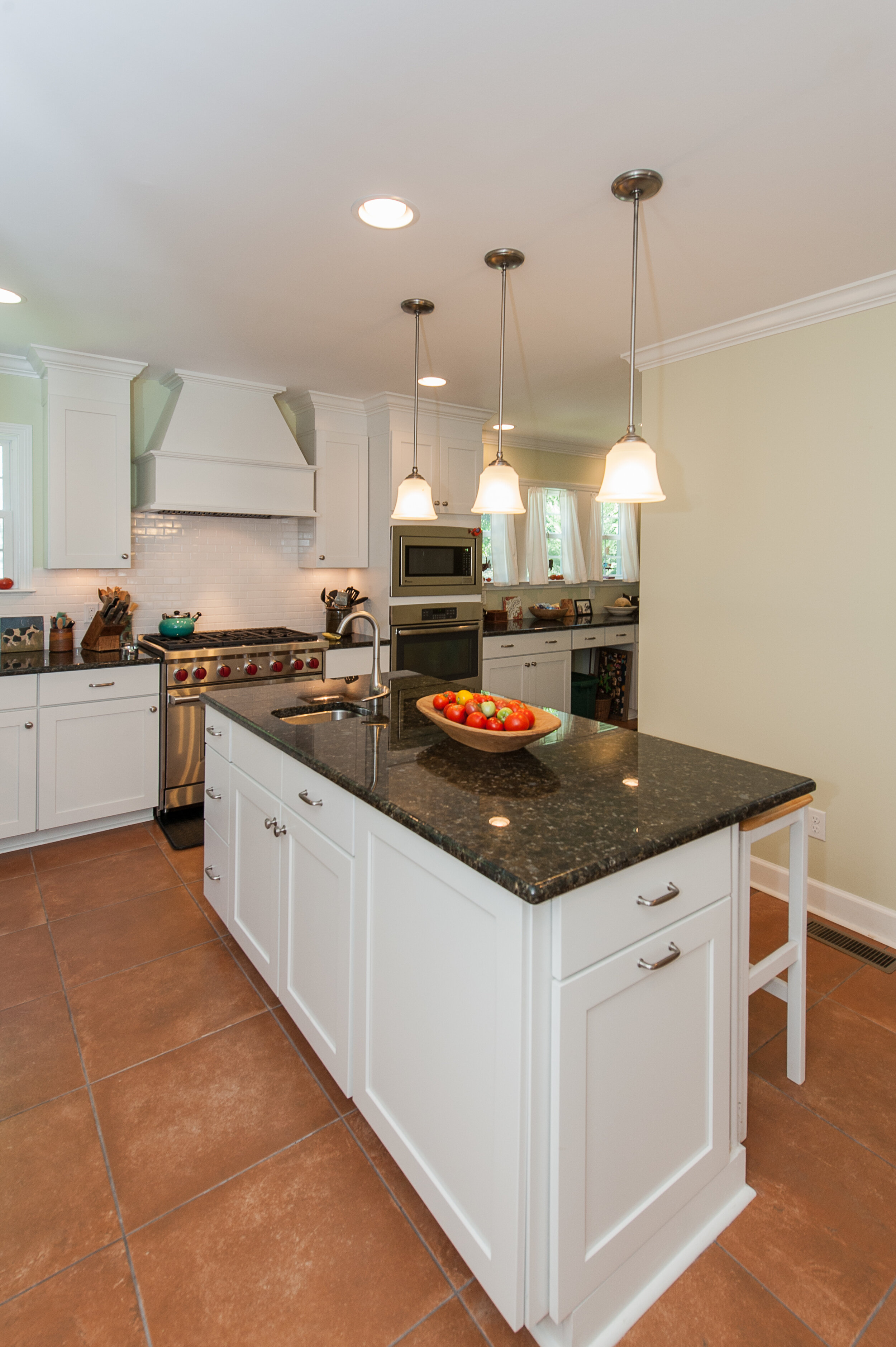 The new kitchen was created by gutting the old kitchen and also by adding a small 60-square-foot addition. This tiny amount of additional space was the critical improvement, giving the kitchen a more functional shape; even enlarging the space enough to allow for the installation of an island "gathering area" with seating and a prep sink. A new commercial-grade 6-burner range was installed under a custom hood with a built-in wall oven installed just to the right. The new dishwasher was located adjacent to the kitchen sink, allowing for easy loading and unloading with minimal effort, and a state-of-the-art refrigerator was installed, recessed in a custom wall opening.